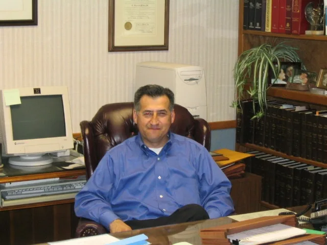 Who sits at the desk.