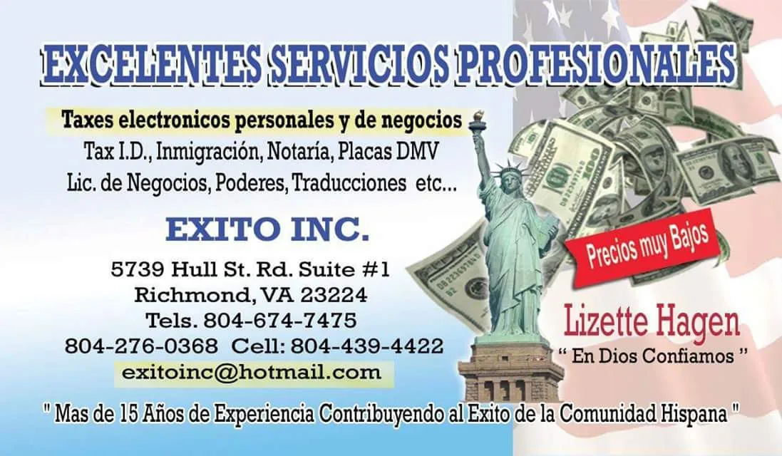 Exito Tax & Services is an individual tax preparation office in Richmond, Virginia, located at 5739 Hull St 1 Second Floor, Richmond, VA 23224.