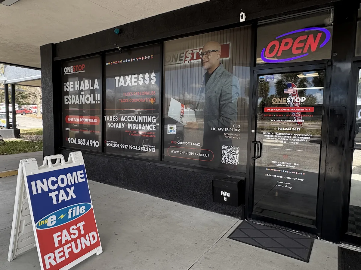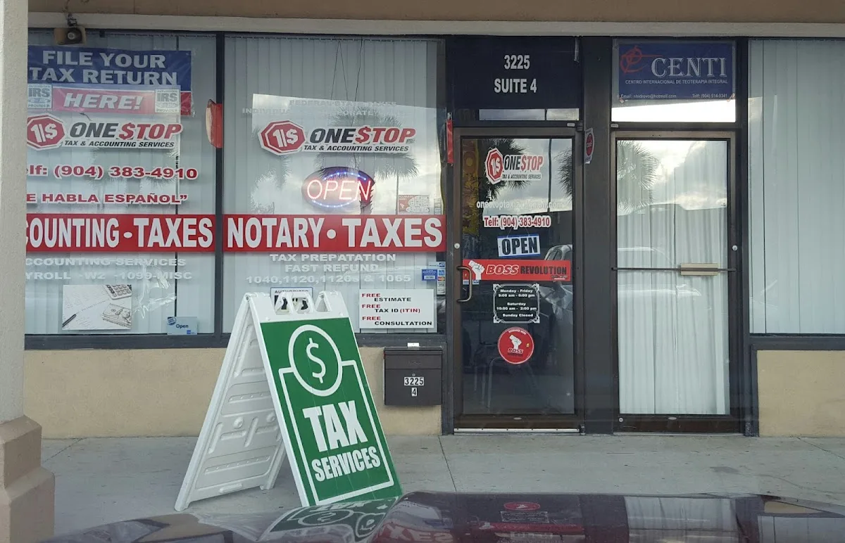 One Stop Tax & Accounting Services is a tax preparation office in Jacksonville, Florida, located at 3225 Southside Blvd #4, Jacksonville, FL 32216.