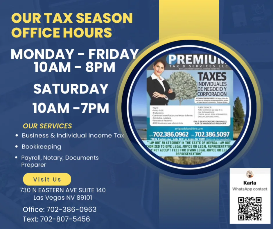 The office supports clients who need help preparing their taxes, using an organized service approach that emphasizes clear explanations and careful review during the appointment. For most taxpayers, accurate filing relies on proper review of income documentation, correct entry of reported figures, and appropriate application of deductions and credits when relevant. Premium Tax & Services LLC is positioned to help clients understand the filing process step-by-step, including what information is used to complete the return and how key inputs affect the final results. Clients often choose a local office-based preparer to reduce confusion around common tax questions, particularly when forms are detailed or when returns involve multiple types of income. The office is provide guidance that helps clients stay informed throughout preparation, treating tax filing as a structured process rather than a purely transactional step. Premium Tax & Services LLC serves the Las Vegas area and supports taxpayers who value timely preparation, responsive communication, and careful handling of documentation. Prospective clients can contact the office to confirm appointment details and to bring the documents needed for their specific filing scenario. Overall, the business is intended for individuals who want professional help preparing their return and for clients who prefer a preparer who can explain practical aspects of the process during the appointment.