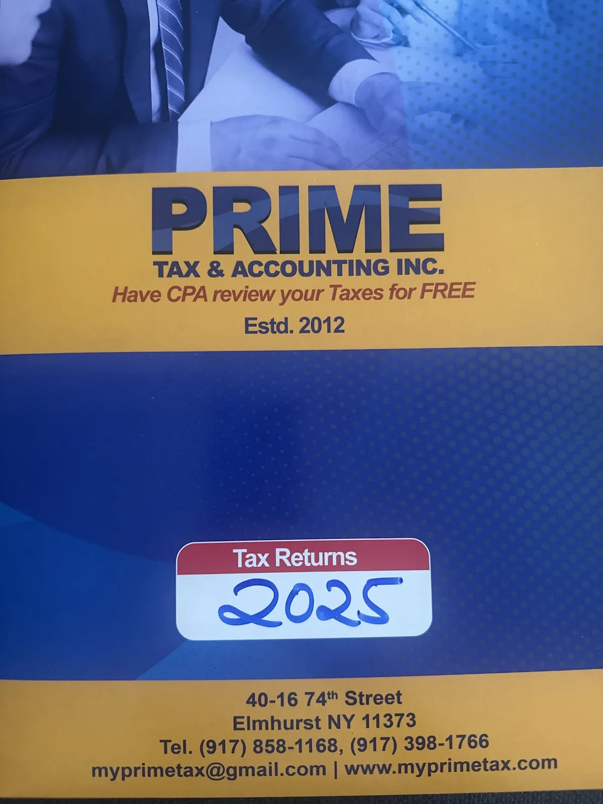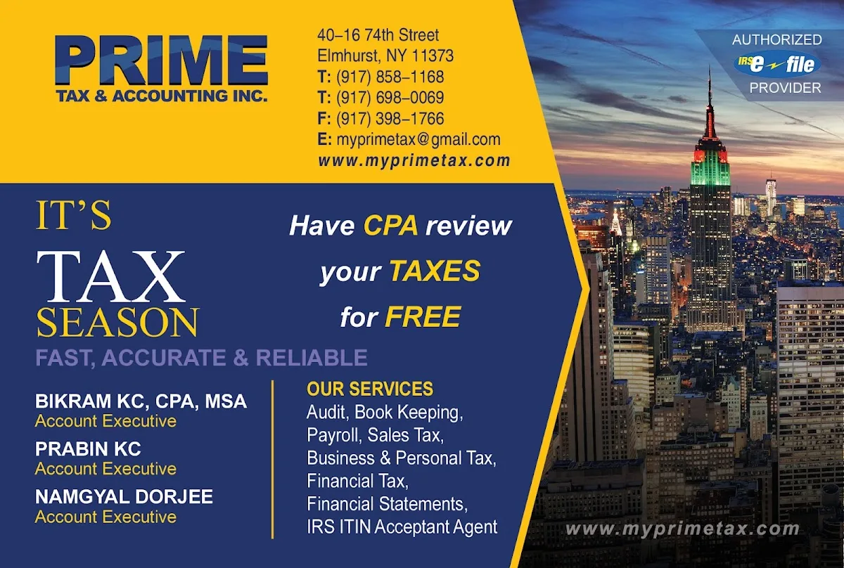 Filing your return early is the most effective way to claim your refund sooner and stay ahead of the April deadline. Why choose Prime Tax and Accounting? Our team of Highly skilled Tax Preparers, Enrolled Agent (EA) and CPA brings a high level of expertise to every return. We are federally authorized tax practitioners who can represent taxpayers before the IRS. We stay current on all the latest tax law changes to ensure you maximize your deductions and remain fully compliant. Serving the community since 2012 *The Benefits of Filing Early:* Faster Refunds:* Get your money back into your pocket sooner. Expert Guidance:* Work with our EAs and CPAs to identify tax-saving opportunities. Identity Protection:* Filing early helps prevent tax-related identity theft. Call or email us now for a FREE consultation!* We are available to review your documents, answer your questions, and ensure you are prepared for a successful tax season. We look forward to working with you! Best regards, The Team at Prime Tax and Accounting 4016 74th Street Elmhurst, NY 11373 Phone: 917-858-1168, 917-650-8342 Email: myprimetax@gmail.com Open 7 days