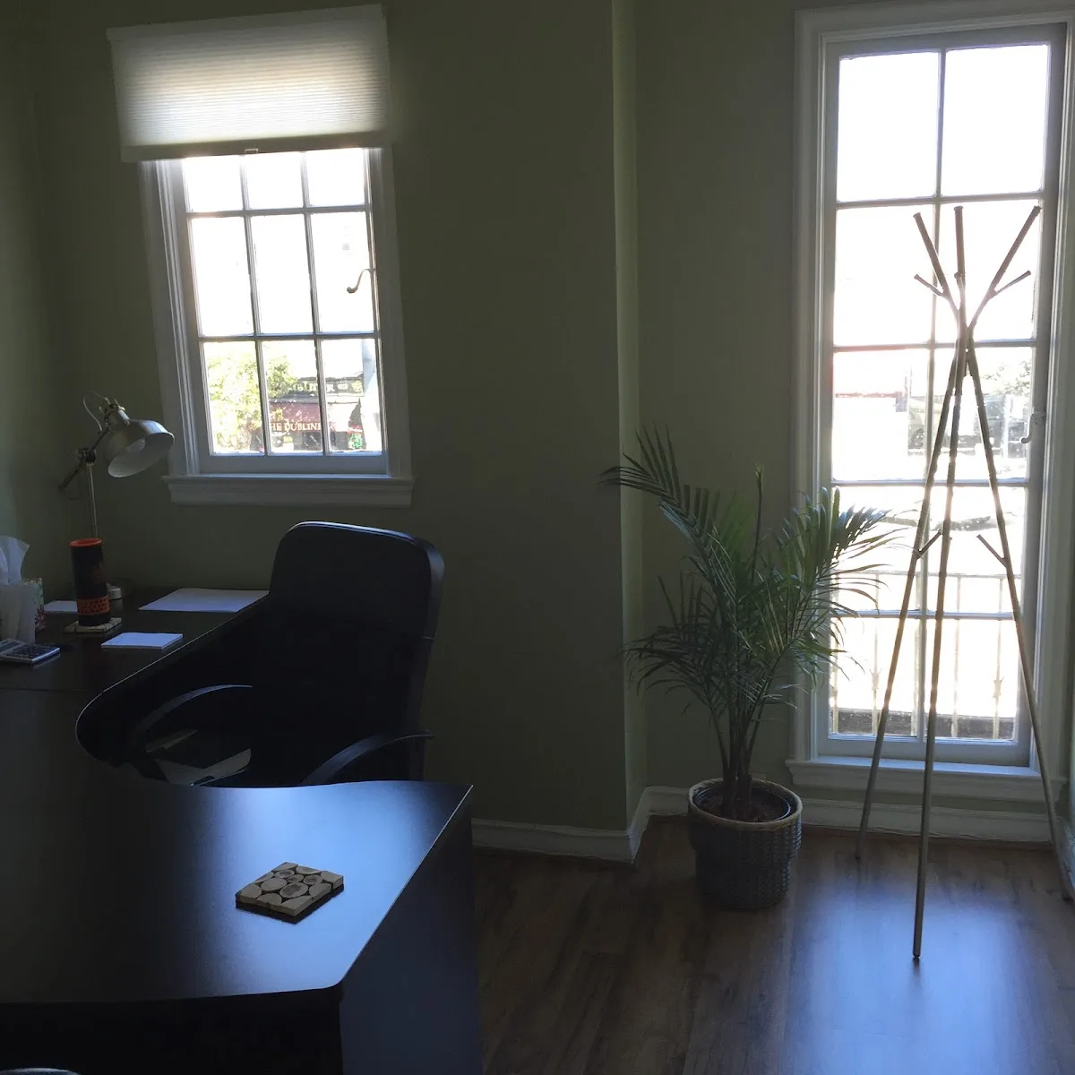 Who sits at the desk.